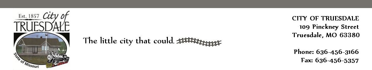 Welcome to the official website of the City of Truesdale, Missouri. We have created this resource to provide the residents of our community with quick access to information about local government and city services – from city council meetings to community events to contacting City Hall with the click if a mouse – you’ll find it here! We also hope to use this resource to attract new business and to further the growth and progress of Truesdale. Please feel free to contact city officials via this website with any community-related questions you may have.